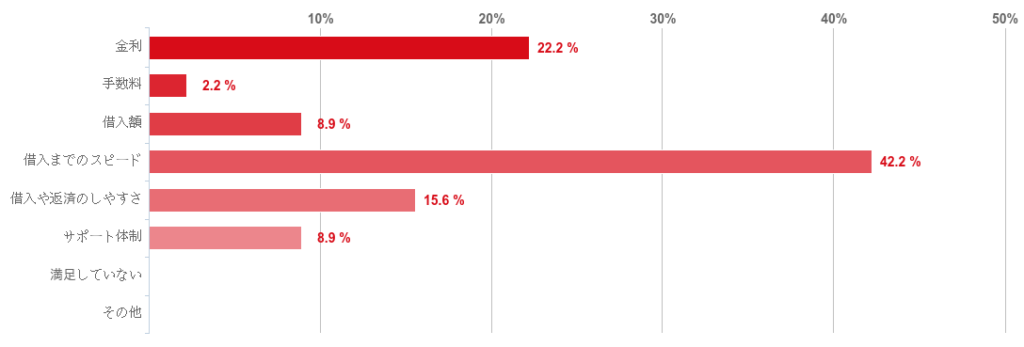 アンケートによれば、最も評価している点には「借入までのスピード」が最も多く挙げられ、次いで「金利」という結果となった。