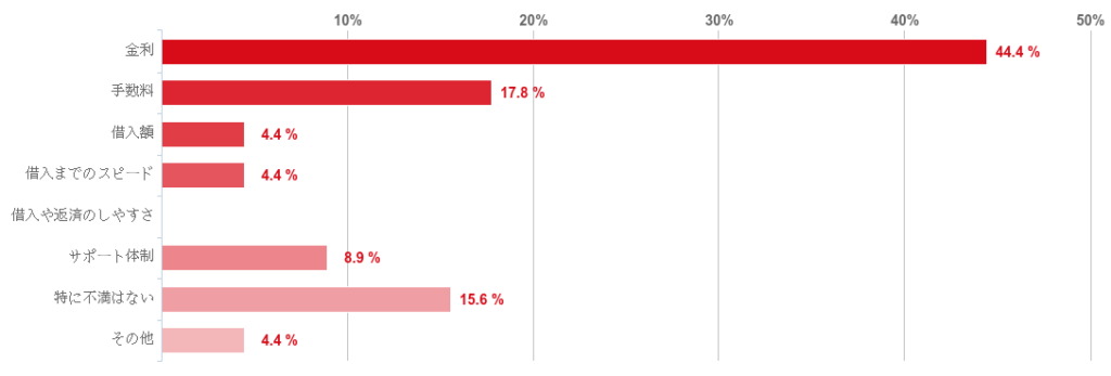 アンケートによれば、「金利」と回答した人が44.4%で最も多い結果となった。他社と比較してより低い金利を求める人からの意見が寄せられていると考えられる。