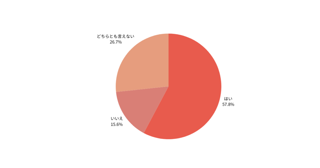 SMBCモビットのカードローンを周囲におすすめしたいと回答した人は57.8%に上った。その他「どちらとも言えない」が26.7%、「いいえ」は15.6%となった。
