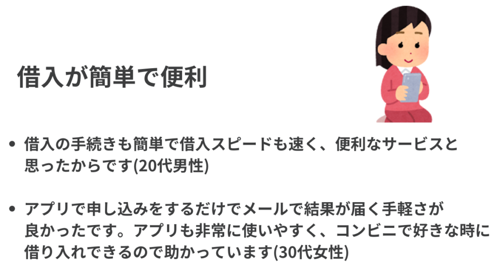 アンケートによれば、借入や返済手続きの利便性についても借入までのスピードと同じく概ね高い評価が集まった。