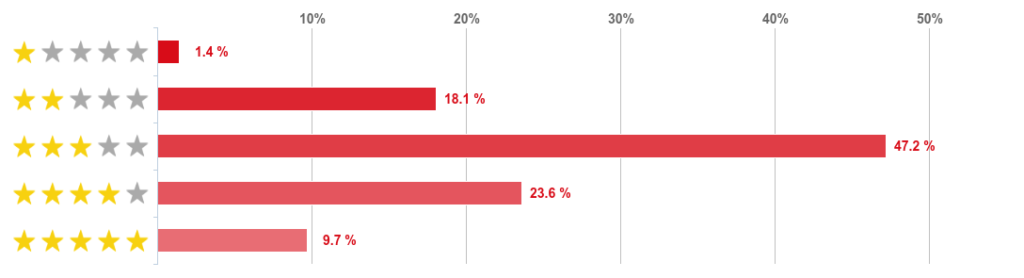 アコムのカードローンの金利は年3.0%〜年18.0%と消費者金融のカードローンの中では平均的な水準となっている。そのため3点と評価するユーザーが最も多いものと考えられる。