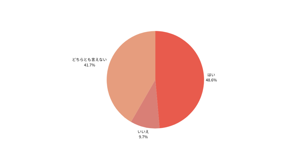 アコムのカードローンを周囲におすすめしたいと回答した人は48.6%に上った。その他「どちらとも言えない」が41.7%、「いいえ」は9.7%となった。