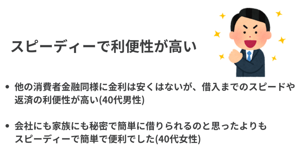 アンケートによれば、最も評価している点には「借入までのスピード」が圧倒的に多く挙げられ、次いで「借入や返済のしやすさ」という結果となった。