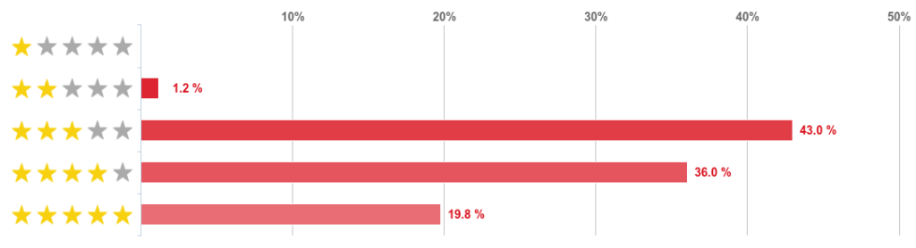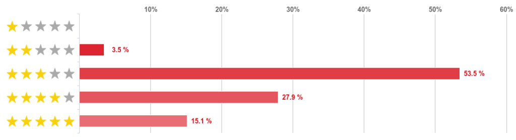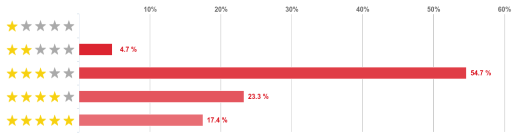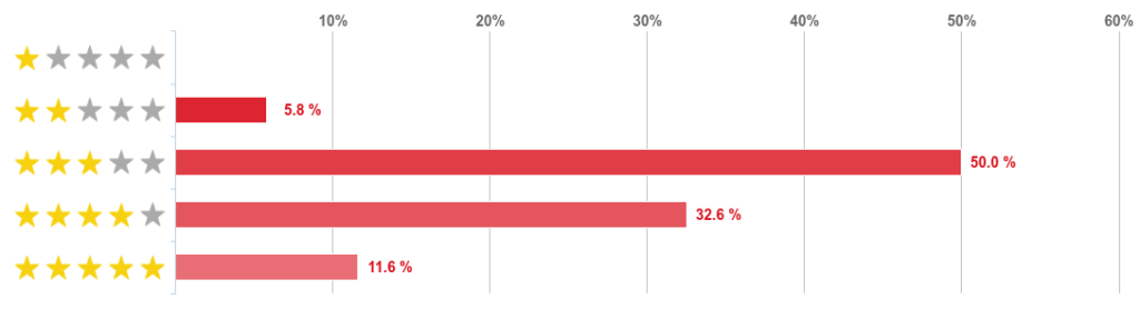アンケートによれば、イオン銀行カードローンの金利については3点と評価した人が最も多く全体の約5割を超えた。また、4点および5点と評価した人も合わせると9割超という結果となった。