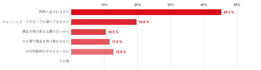 なお、上記の借入方法を選んだ理由について尋ねたところ、「即時入金されるから」が最も多く45.3%、次いで「キャッシュカードがなくても借入できるから」が19.8%という結果となった。