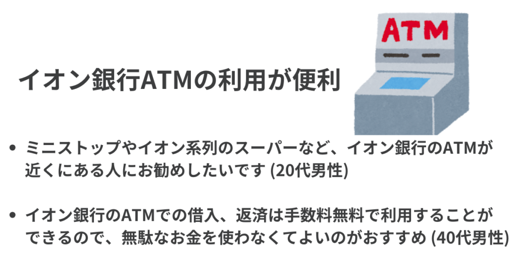 なお、イオン銀行カードローンをおすすめする理由についても尋ねたところ、下記のようにいくつかの意見が寄せられた。