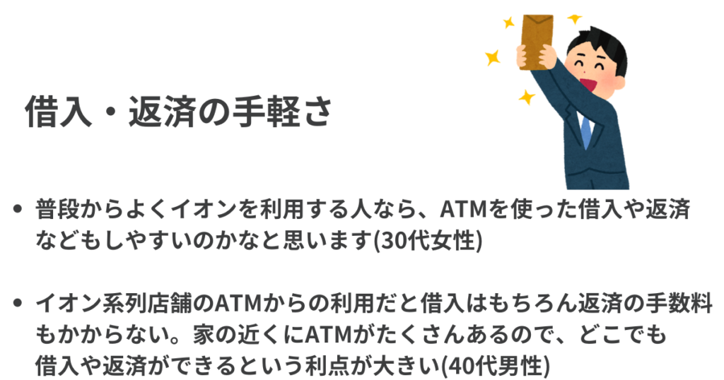 WEBで申し込みが進む点、さらにイオン銀行ATMなど提携ATMから手数料無料で借入・返済できる点など、イオン銀行カードローンには様々なメリットがある。ユーザーはこれらを便利だと感じているのだろう。
