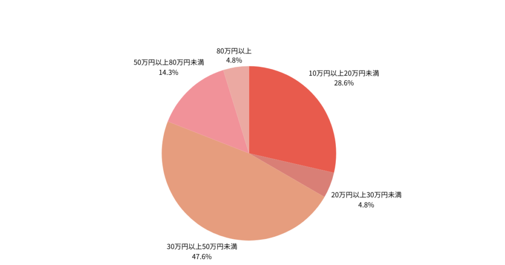 アンケートによると、借入額は30万円以上50万円未満が47.6%と最も多く、これに10万円以上20万円未満が28.6%で続く結果となった。