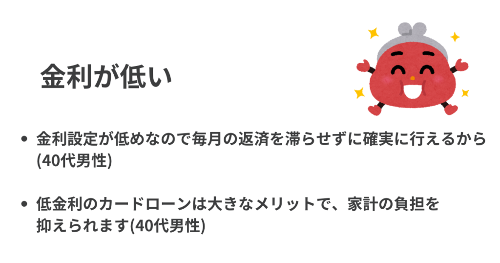 「スターカードローンα」は、銀行カードローンには珍しく無利息期間がある。また先述の通り、金利も比較的低く設定されていることから、金利について評価する意見が最も多かったものと考えられる。