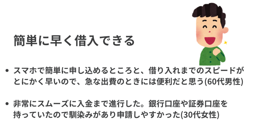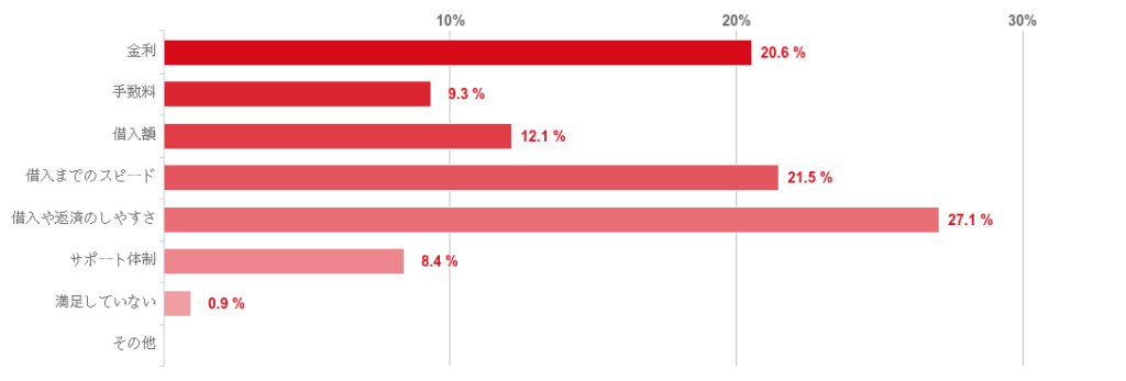 アンケートによれば、最も評価している点には「借入や返済のしやすさ」が挙げられ、3割近い結果となった。