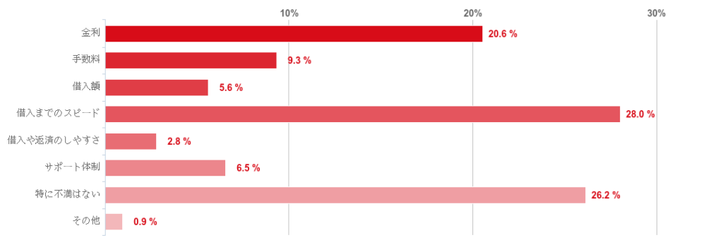 アンケートによれば、「借入までのスピード」が28%で最も票を集めたものの、「特に不満はない」と回答した人も26.2%となり、住信SBIネット銀行カードローンの一定の満足度を表す結果となった。