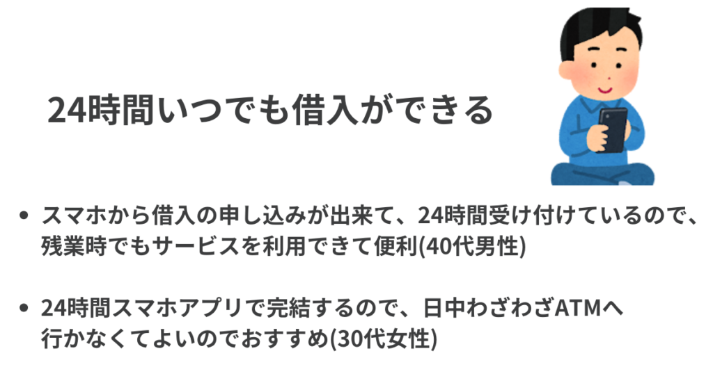 先述の通り銀行カードローンには珍しく即日融資も可能であり、アプリなどで簡単に借入できて即時入金されることに満足している人が多いと推測される。