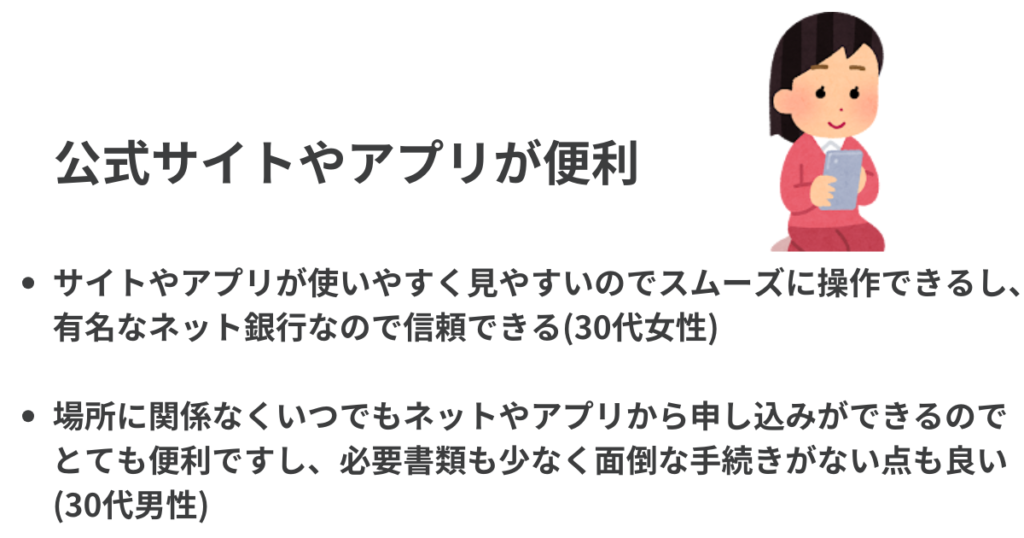 アプリや公式サイトで申し込みが進む点、さらにコンビニ等の提携ATMから借入できる点など、住信SBIネット銀行カードローンには様々なメリットがある。ユーザーはこれらを便利だと感じているのだろう。